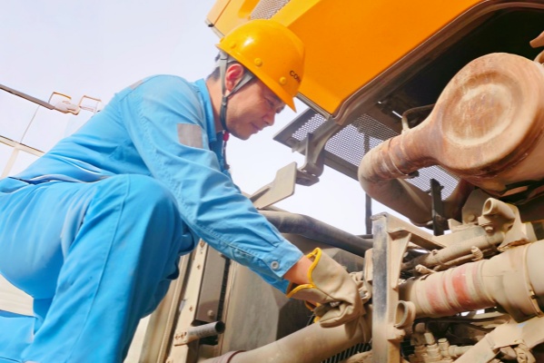 水泥分廠裝載機(jī)班長黃尤紅正在對裝載機(jī)進(jìn)行360度巡檢,確保車輛性能完好,為水泥生產(chǎn)原材料輸送效率提供可靠的保障。(楊雪峰/攝)
