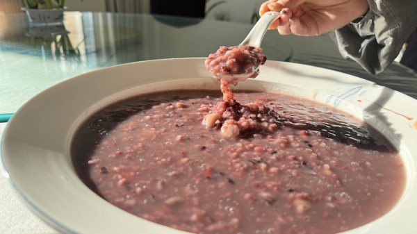 清晨,海拔三千多米的八宿還浸在冬日的清冽里,而八宿海螺食堂的窗戶早已暈開一團溫暖的霧氣。霧氣里,氤氳著一股平原地區(qū)熟稔的醇厚甜香——那是糯米、紅豆、紅棗、花生在文火慢燉中交融的氣息,是臘八粥的味道。幾位早到的藏族同事循著香氣駐足,好奇追問:“今天的早飯,怎么這樣香?”